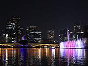 大川水面上の右岸側に約100メートルの噴水を設置し、音楽に合わせ色とりどりの光に照らされた噴水が上がります。この日は大阪・関西万博のオフィシャルテーマソング「この地球(ほし)の続きを」や「大阪LOVER」がバックに流れました。(写真1、2)