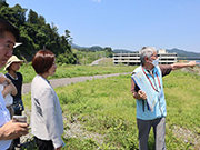 続いて大船渡港海岸、野々田緑地を訪れました。東日本大震災を教訓に湾の入り口の防波堤、港区域の防潮堤の二段構えで粘り強く津波に耐える構造となるよう創意工夫がされています。津波で施設の大半を失った野々田緑地は防潮堤の内側に再整備されました(写真3)。私たちは一画に設けられた展望台で復興状況の説明をお聞きしました(写真4)。