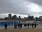 十三船着場前の広場で開かれた「淀川大堰閘門及び十三船着場利用開始記念報告会」に出席しました。(写真1)